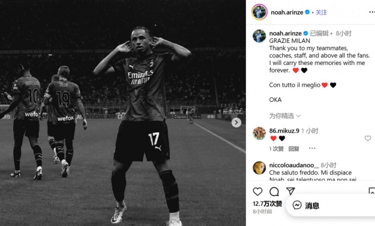 奥卡福写道:“谢谢米兰!感谢我的队友、教练、工作人员,尤其感谢球迷们。我将永远珍藏这些回忆。❤️🖤”